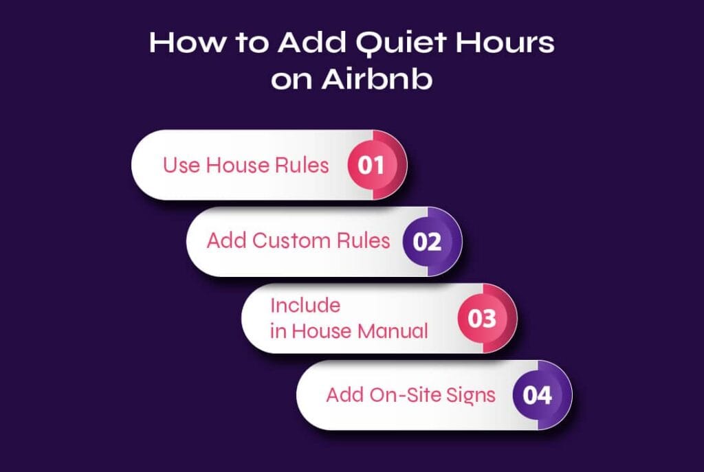 Hosts can add quiet hours in Airbnb House Rules so guests agree before booking. Use clear rules like “Quiet hours 10 PM–7 AM.” Put reminders in your house manual or on signs. Adjust hours based on your property type.