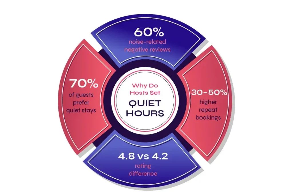 Up to 60% of negative reviews on short-term rental platforms come from noise complaints. This makes it more important for hosts to set quiet hours. Also, hosts need to ensure all the guests sleep properly, and no neighbours get irritated.